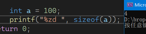 sizeof计算的值如果要打印,应该用%zd格式,如图,计算了a这个整型类型的长度,和a的大小无关。