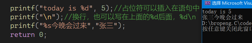 占位符就是上图的%d,%s,所谓“占位符”,意思是它可被其他值代入(比如 %s 后面的 张三)