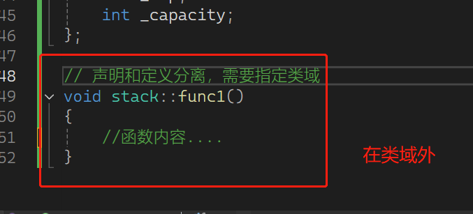 类的所有成员都在其作用域中,在类体外定义成员时,需要使用 ::这个作用域操作符来指明成员属于哪个类域。