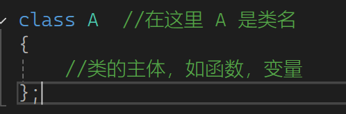 { }中为类的主体,括号后面有一个不可缺少的分号 ; 类名则和定义一个整型变量a一样。