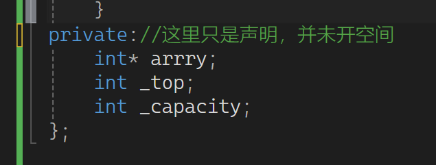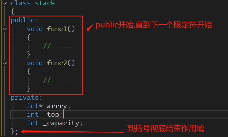 4.访问限定符的作用域仅在其最开始出现的位置开始,下一个出现时结束,若后面再无,则到右大括号 } 结束。说出来恐难以理解,以下是代码示例: