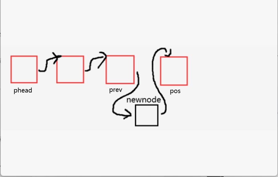 :头文件不能为空,也不能在空之前插入结点,首先要找到pos位置的前一个结点让它的next指针指向newnode,然后让newnode的next指针指向pos。如何找到pos的前一个结点?那就是遍历,从头结点开始,向后遍历,直到prev的next指针指向pos则就是pos的前一个结点。这里要注意,当pos为头结点的时候,执行的操作就变为了头插。