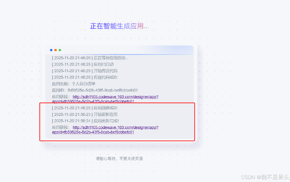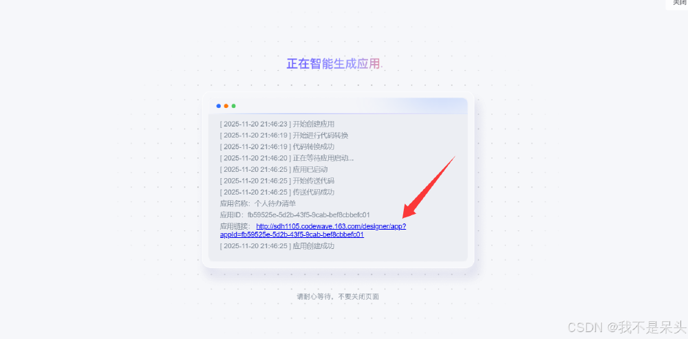 • 系统会进入loading界面(耗时约3-5秒),生成完成后会显示应用链接。