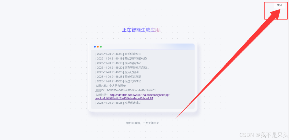 • 若需要回到应用生成的聊天界面,点击IDE右上角"关闭"按钮即可,系统会保留之前的对话记录和生成结果,方便后续调整。