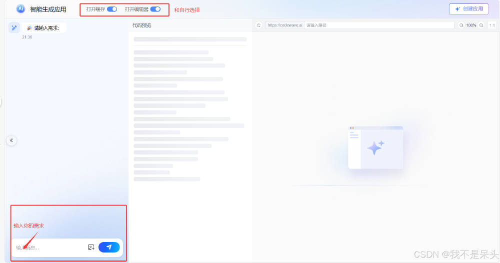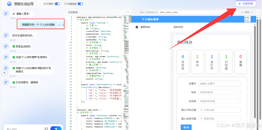 + 需求输入并生成满意的应用原型后,点击右上角"创建应用"按钮![](https://i-blog.csdnimg.cn/img_convert/a2f94f03d150ed36f66c5edfb4bafa05.png)