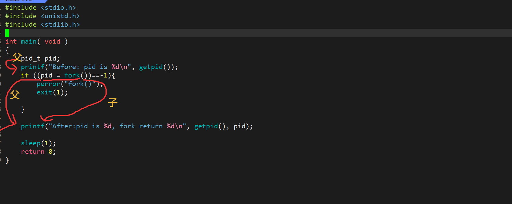 printf("After:pid is %d, fork return %d\n", getpid(), pid);