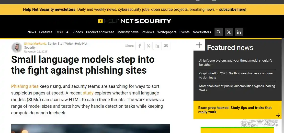在此背景下,小型语言模型(SLM)——泛指参数量低于200亿、可在消费级CPU或低端GPU上运行的语言模型——成为平衡性能与成本的潜在解决方案。2025年11月,一项由Help Net Security报道的研究首次系统评估了SLM在钓鱼检测任务中的能力,指出其在保持低计算需求的同时,具备识别可疑HTML模式的潜力。
