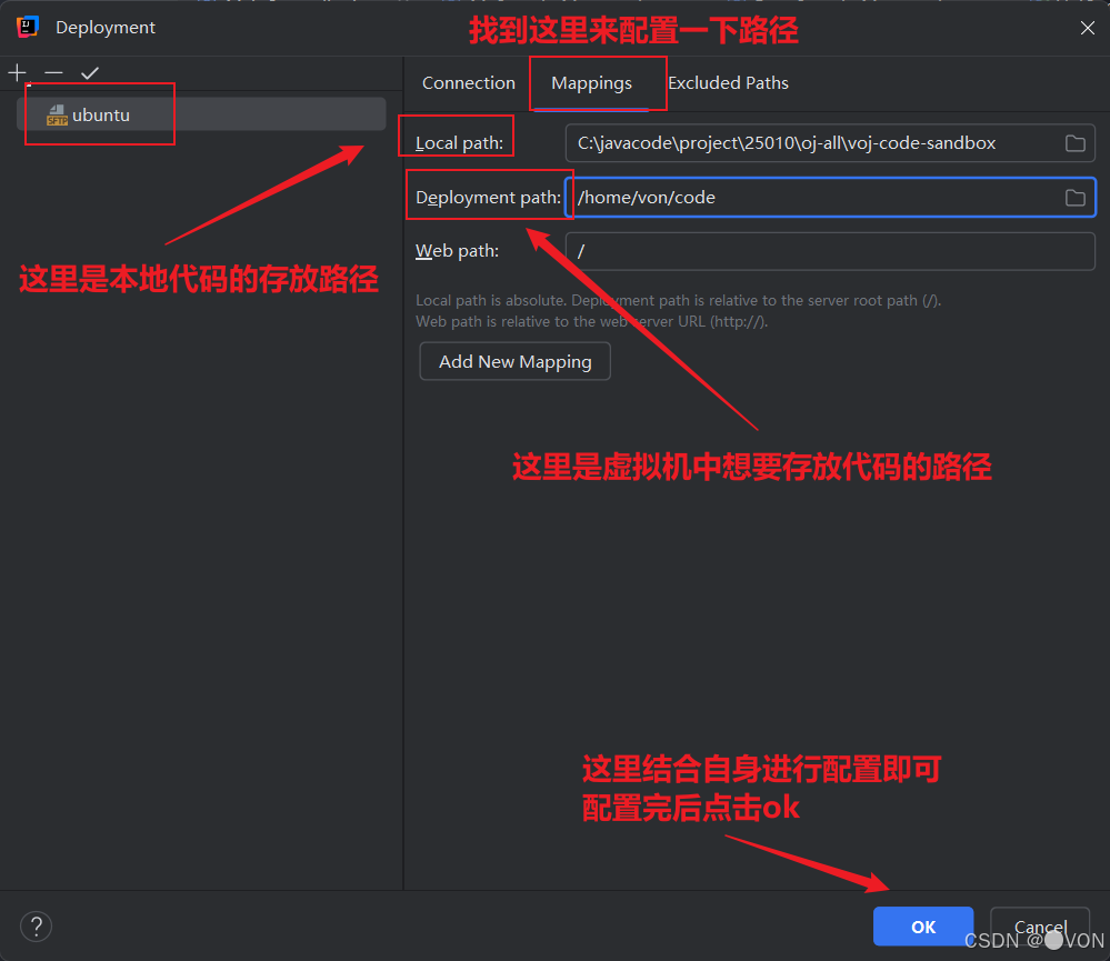 这里的路径,本地是默认填充的不用管,主要是下面那个路径,要和虚拟机中对应