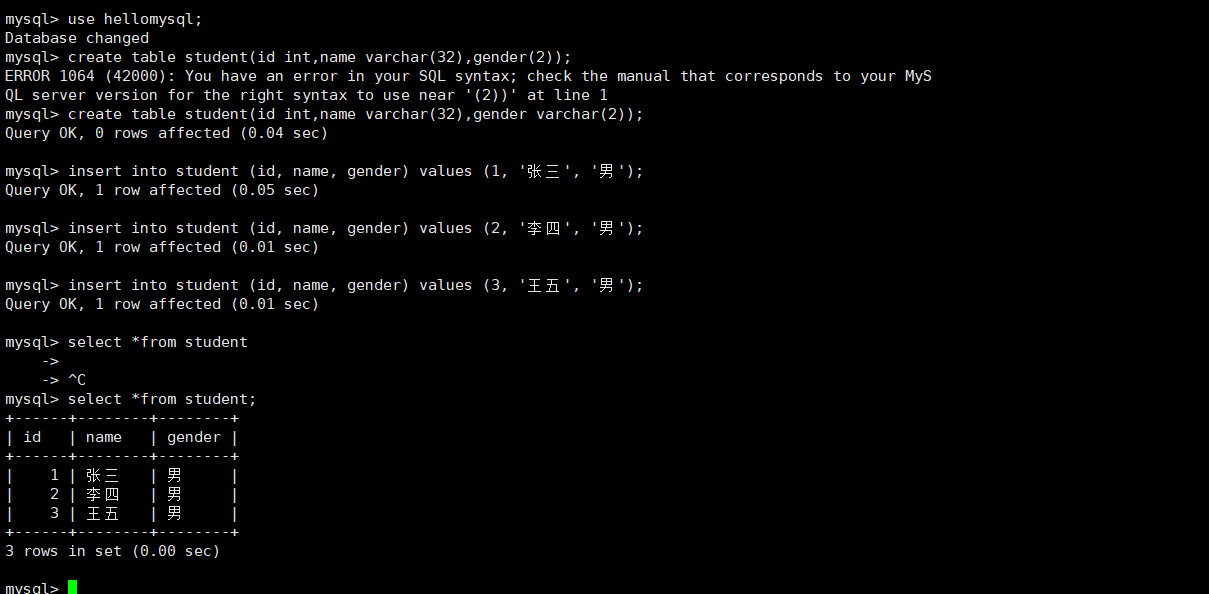insert into student (id, name, gender) values (3, '王五', '男');查询表中数据