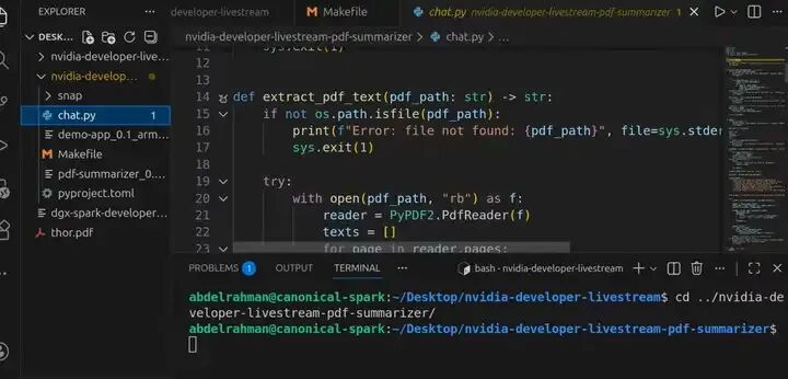 该应用首先提取PDF文本内容,随后基于提取的文本调用相同代码逻辑,并赋予系统提示词:“你是一位擅长文档摘要与冗余信息剔除的助手,请总结这份PDF文件。” 以Nvidia Jetson Thor技术文档为例——虽然VS Code可能无法直接显示PDF,但通过本地推理可生成摘要。
