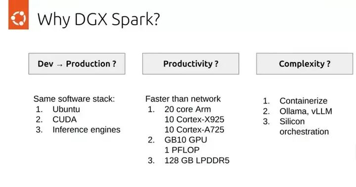 一个关键问题是:如何将开发阶段的AI应用顺利过渡到生产环境?无论是本地AI推理、模型微调还是其他AI任务,如何实现开发到生产的无缝衔接?能否统一技术栈?好消息是——完全可以!因为DGX Spark运行Ubuntu系统,内置CUDA生态,支持ARM架构的多种推理引擎,可直接在设备上进行本地推理。更棒的是,这套技术栈能直接迁移到云端生产环境,实现开发-生产环境的一致性。