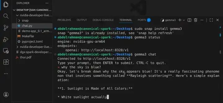 通过运行Gemma 3 status命令,可以看到该快照正运行在Nvidia GPU ARM64架构上——这意味着这个开源模型已针对DGX Spark上的Nvidia GPU进行了专门优化,并提供了本地主机端点供调用。接下来我将演示基于此构建的应用,但先简单测试下快照功能:运行Gemma 3 chat会打开聊天界面,显示已连接本地主机,此时输入提示词(比如经典问题“为什么天空是蓝色的”),响应速度极快,比传统服务器-客户端流传输更迅速。