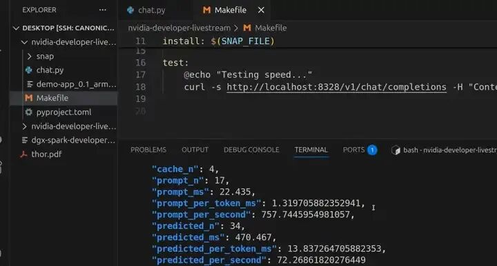 现在我想展示测试环节——通过向聊天接口发送curl请求,我们可以实时观测到每秒处理的token数量,这是最贴近实际场景的性能验证。当发送测试提示后,系统展现了惊人的处理速度:每秒可处理70至80个token,而这仅仅是我们在DGX Spark上对该模型进行初步优化的成果。未来通过缓存机制升级和持续调优,还能进一步提升token处理速率。