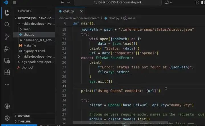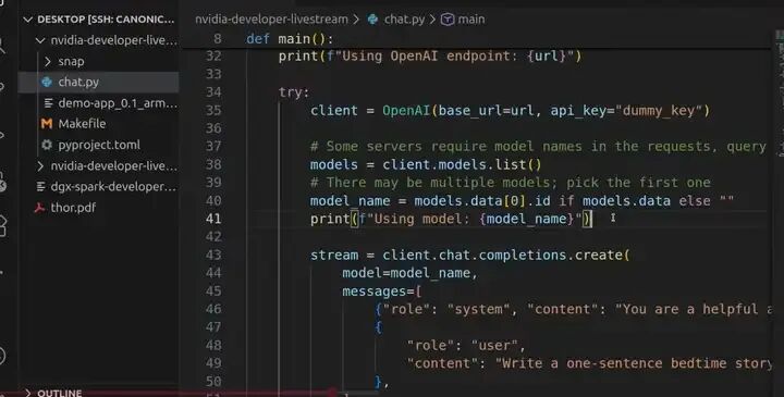 那么如何基于快照构建应用呢?看这个名为“chat”的Python应用。代码非常简洁:首先读取快照数据,获取我们之前通过GMA3 status看到的JSON状态文件,从中提取快照提供的端点URL。关键点在于:现有兼容OpenAI或其他服务商的代码只需修改URL即可复用,无需API密钥,因为所有操作都在本地完成。