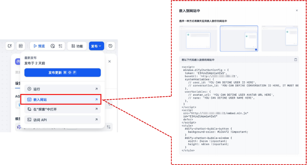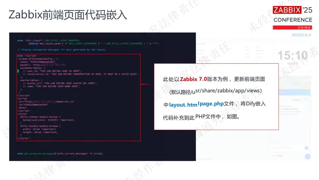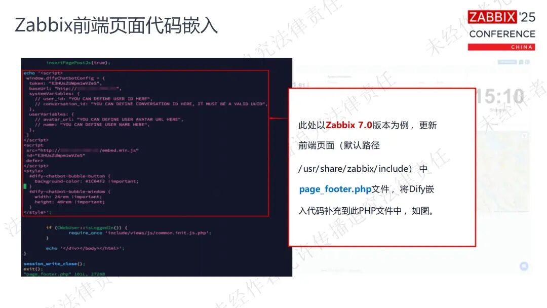 这里我们需要修改Zabbix前端的少量PHP代码,将Dify嵌入我们的Zabbix网页中,我们的网页就可以进行大模型对话了,我们需要修改Zabbix前端指定目录下的两个PHP文件,分别是/usr/share/zabbix/app/views目录下的layout.htmlpage.php文件和/usr/share/zabbix/include目录下的page_footer.php文件,分别把Dify服务中的前端内嵌代码复制粘贴到以上两个PHP文件中。