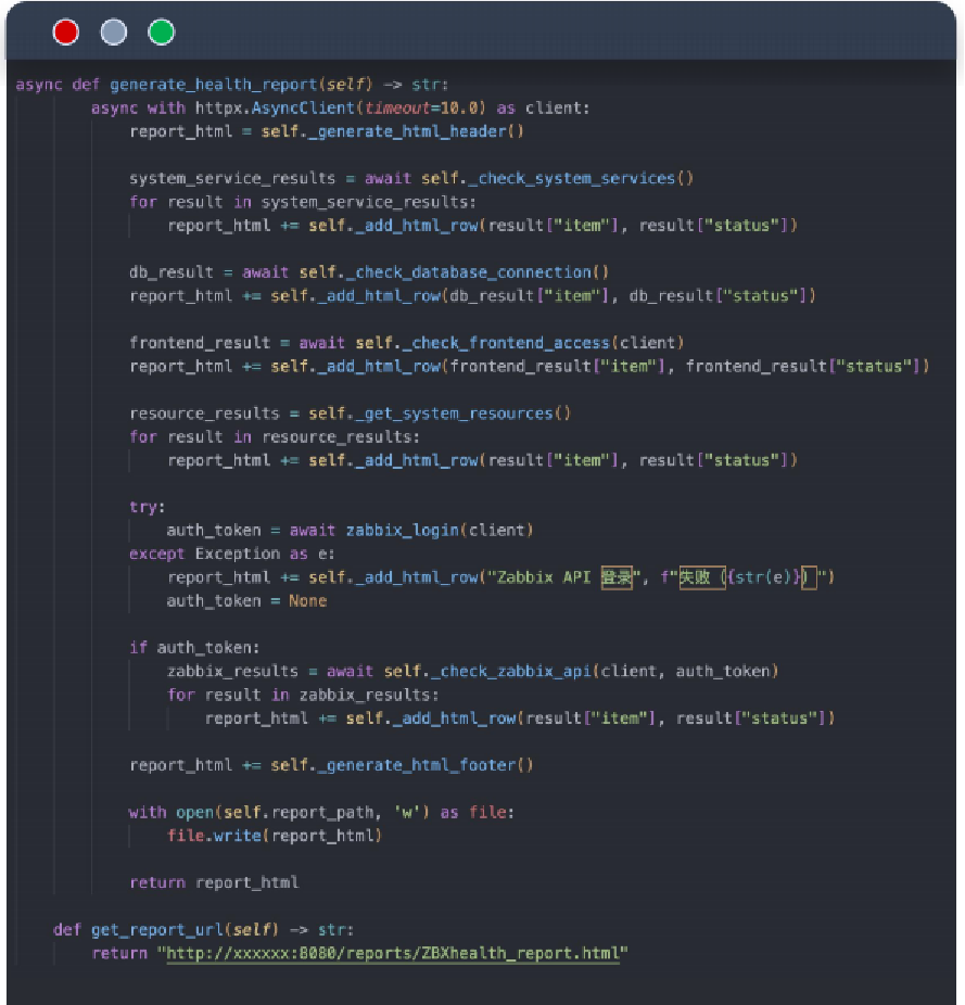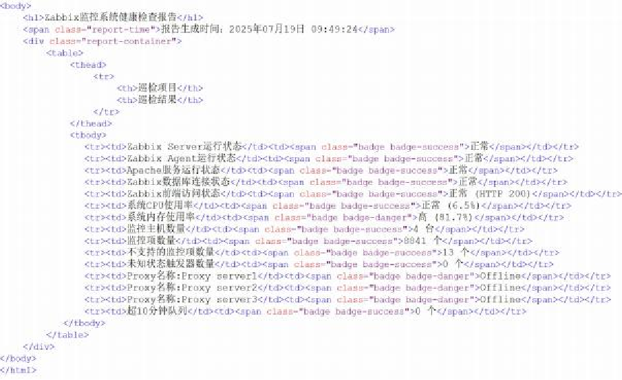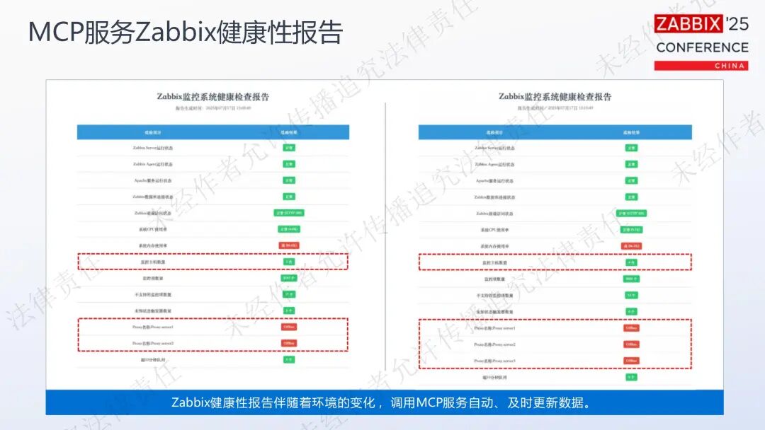 我们输入一个Zabbix巡检给大模型,大模型就可以给出我们的一个巡检报告,如图,Zabbix健康性报告伴随着环境的变化 ,调用MCP服务自动、 及时更新数据。