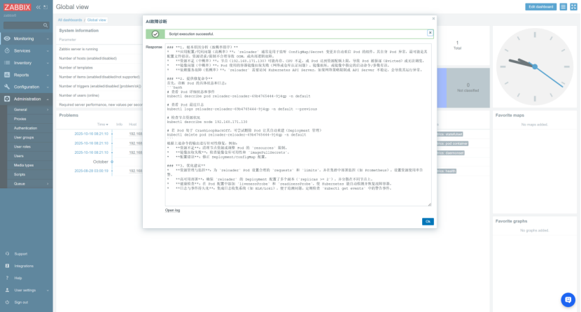 文件更新完成后,刷新一下Zabbix前端页面,右下角多出了一个小助手按钮,用户可以单击此按钮调用Dify,输入关键字利用AI大模型的分析能调用对应的MCP服务,来实现对Zabbix系统关键项的巡检并给出健康性报告。