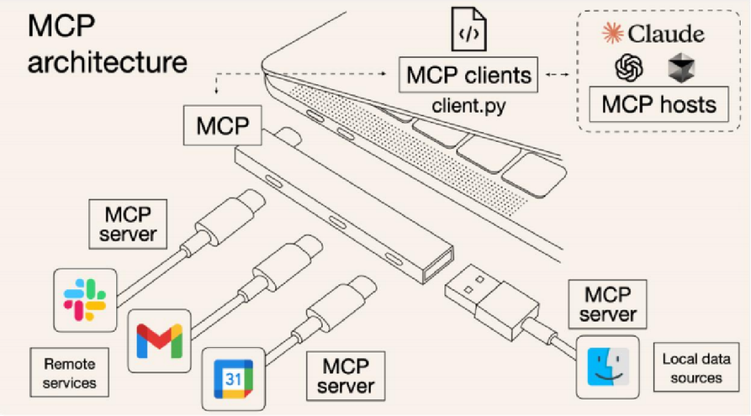 MCP(Model Context Protocol ,模型上下文协议),是由 Anthropic 公司于2024年提出的开放标准协议 ,是一种开放的通信协议,是人工智能领域的 “ USB 接口”。MCP在大模型和外部数据源(数据、工具、开发环境等) 之间建立了双向且更加安全的连接 ,使用单一的标准协议取代碎片化的集成方式。如果把 LLM 比作人的大脑 ,MCP 就是手脚,LLM 不断提升智能下限 ,MCP则是不断提升创意上限。