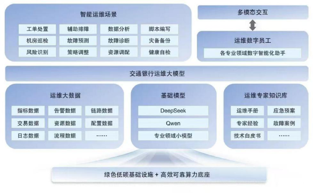 交通银行作为国有大银行之一,“数智融合”也成为了 2025年的必选课题。交通银行作为全球系统重要性银行,以“建设具有特色优势的世界一流银行集团”为战略目标,着力谱写科技金融、绿色金融、普惠金融、养老金融、数字金融五篇大文章。数据中心则侧重于数字金融方面,如何充分利用数字技术和数据要素,不断加大应用创新,持续优化资源配置,面向客户提供智能化金融服务,面向经营管理实现数字化金融展业,更好地服务经济社会高质量发展,也是我们每个运维人员的重要工作方向之一。在这个AI时代,如何深化人工智能应用是关键一步,那我们就要充分运用算力、算法、数据这三大要素。
