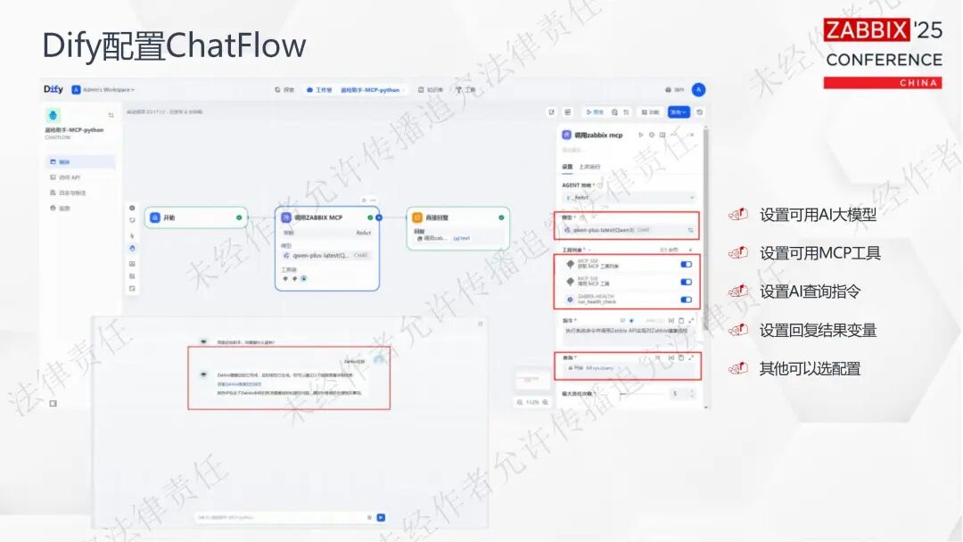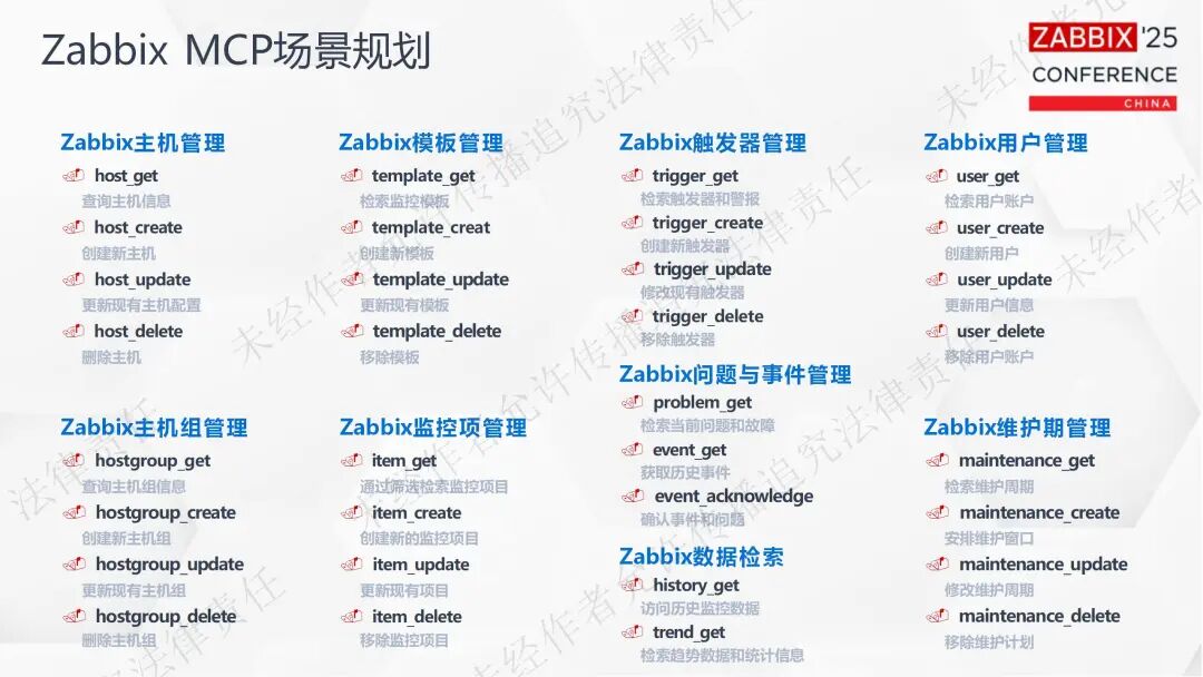 Zabbix平台本身主机、主机组、监控项、触发器、模板、事件管理、用户管理等等均可以尝试通过MCP方法来巡检。同样巡检只是大模型提高我们工作效率的一小部分。学会如何快速上手配置Zabbix平台,如何快速处理Zabbix发出的告警,目前大模型都可以为大家给出一个很好的解决方案。