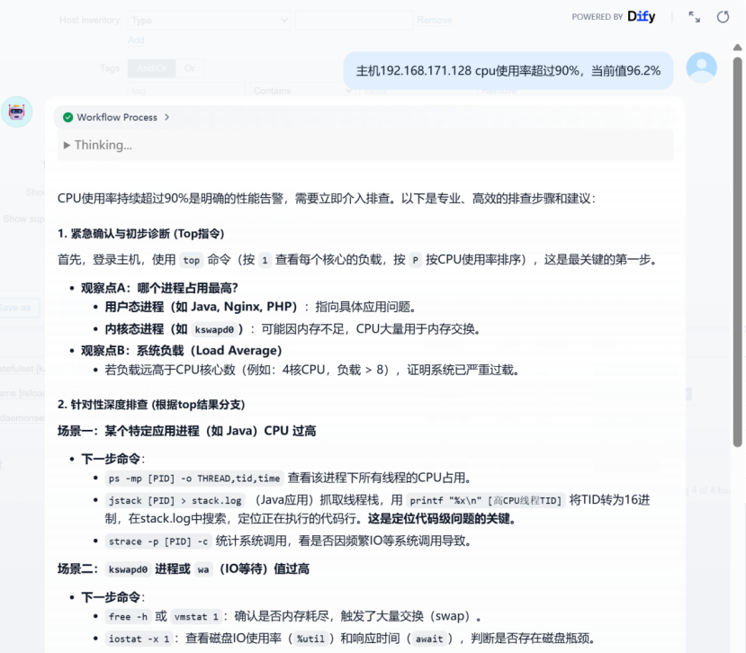 示例:输入主机192.168.171.128 cpu使用率超过90%,当前值96.2%,dify调用模型的故障回复如下:
