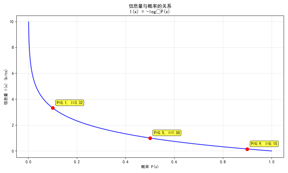 plt.title('信息量与概率的关系\nI(x) = -log₂P(x)')