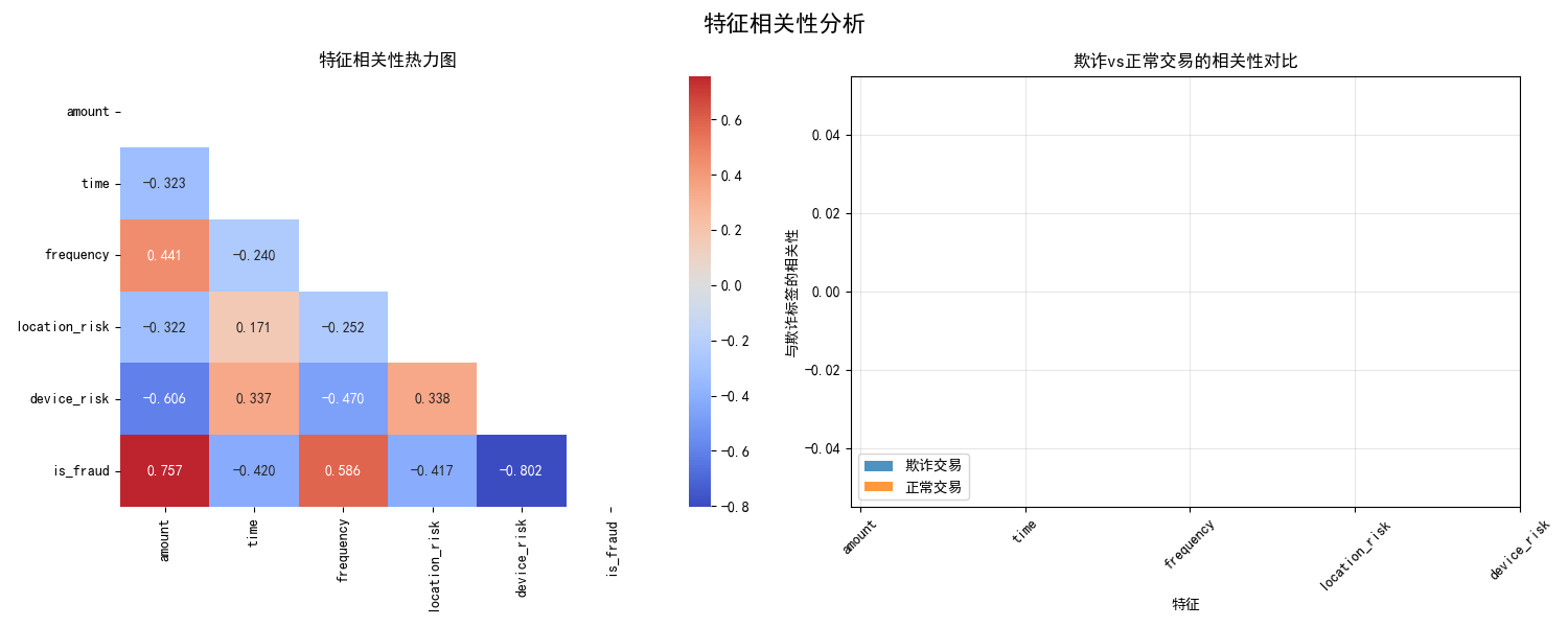 return self.figures=== 金融风控系统 === 金融数据生成完成: 10000 条交易 欺诈交易比例: 0.030 特征分布差异(KL散度): device_risk: 665.3519 location_risk: 234.1907 frequency: 15.9859 time: 14.7650 amount: 0.5321 模型性能评估: AUC Score: 1.0000 准确率: 1.0000 特征重要性排名: device_risk: 0.4510 time: 0.2314 amount: 0.2216 frequency: 0.0887 location_risk: 0.0072 === 异常交易检测 === 交易 0: 高风险 (置信度: 0.570, 欺诈概率: 0.570) 交易 1: 低风险 (置信度: 0.770, 欺诈概率: 0.230) 交易 2: 高风险 (置信度: 0.570, 欺诈概率: 0.570) 交易 3: 低风险 (置信度: 0.820, 欺诈概率: 0.180) 交易 4: 高风险 (置信度: 0.570, 欺诈概率: 0.570) === 交易风险评分 === 交易 0: 风险分数 = 1.000 交易 1: 风险分数 = 0.409 交易 2: 风险分数 = 1.000 交易 3: 风险分数 = 0.302 交易 4: 风险分数 = 1.000 === 金融风控可视化分析 === 生成金融风控分析图表... 特征分布差异(KL散度): device_risk: 665.3519 location_risk: 234.1907 frequency: 15.9859 time: 14.7650 amount: 0.5321