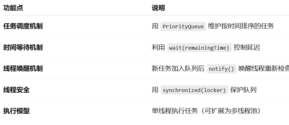 schedule 方法向队列中添加任务,另一个是定时器内部的线程从队列中获取并执行任务。synchronized 关键字、ReentrantLock 等锁机制来保证线程安全。计算任务的目标执行时间:任务的目标执行时间 = 任务提交时的系统时间 + 设定的延时时间(毫秒)