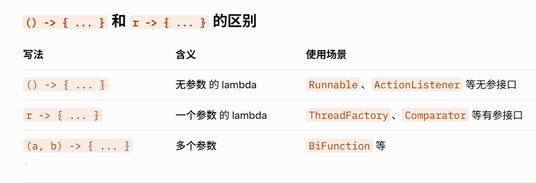 Lambda 表达式本质是 “函数式接口的实例化简化”,但它不是一个独立的类(不同于匿名内部类),也不会生成独立的类对象。它更像是一个 “嵌入在外部类中的代码块”,因此不具备自身的 this 引用。