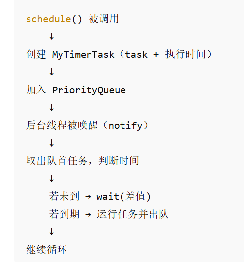 ArrayList 管理多个任务,每次需遍历找到 “执行时间最早” 的任务,效率较低。PriorityQueue),基于 “执行时间” 排序,让时间最早的任务始终在队首,可高效获取待执行任务。schedule 方法实现该方法负责将任务添加到优先级队列中,完成任务的注册。