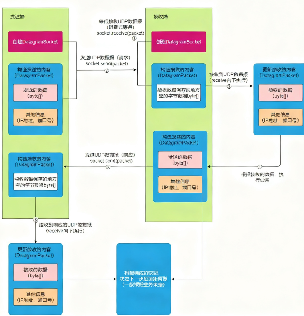 java中使用UDP协议通信,主要基于 DatagramSocket 类来创建数据报套接字,并使用 DatagramPacket 作为发送或接收的UDP数据报。对于⼀次发送及接收UDP数据报的流程如下: