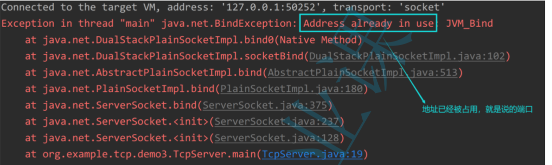 5. 如果⼀个进程A已经绑定了⼀个端口,再启动⼀个进程B绑定该端端口,就会报错,这种情况也叫端口 被占用。对于java进程来说,端口被占用的常见报错信息如下: