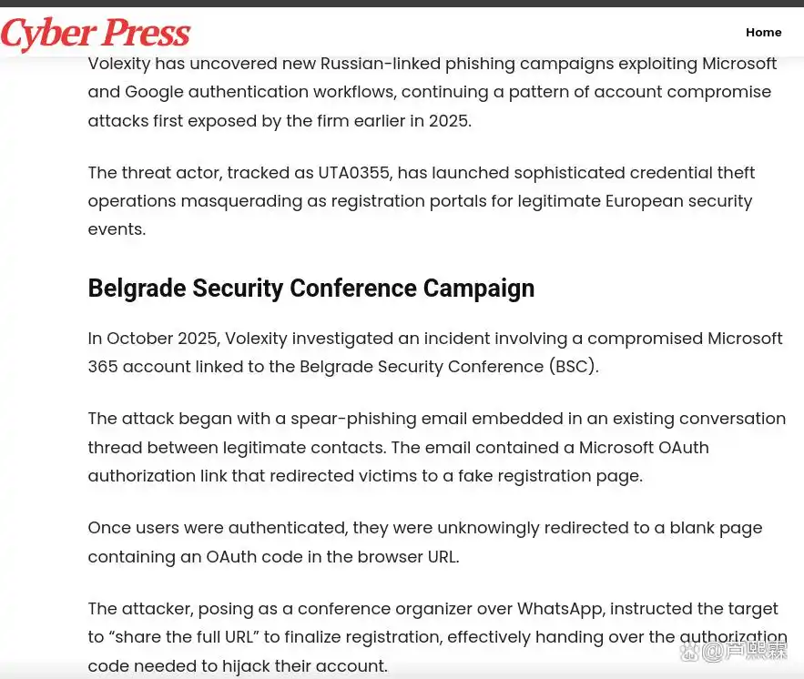 本文系统分析了俄罗斯关联团伙UTA0355利用欧洲安全会议名义实施的OAuth定向钓鱼攻击,揭示其如何通过高仿真社会工程与协议机制滥用,实现对企业云账户的隐蔽接管。研究表明,此类攻击的成功并非源于技术漏洞,而是对身份信任链的精准操控。防御上,必须超越传统的边界防护思维,转向以身份为中心的零信任架构。通过实施OAuth应用白名单、自动化授权审计、用户行为缓冲与威胁情报联动,企业可显著降低此类高级钓鱼威胁的风险。未来工作将聚焦于开发基于上下文的风险自适应授权引擎,实现“动态同意”机制,从根本上重塑OAuth的安全范式。