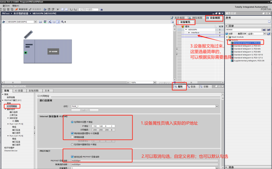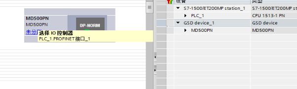 拖过来后,显示未分配,可以先配置下选中黄色区域的PLC的PROFINET接口: