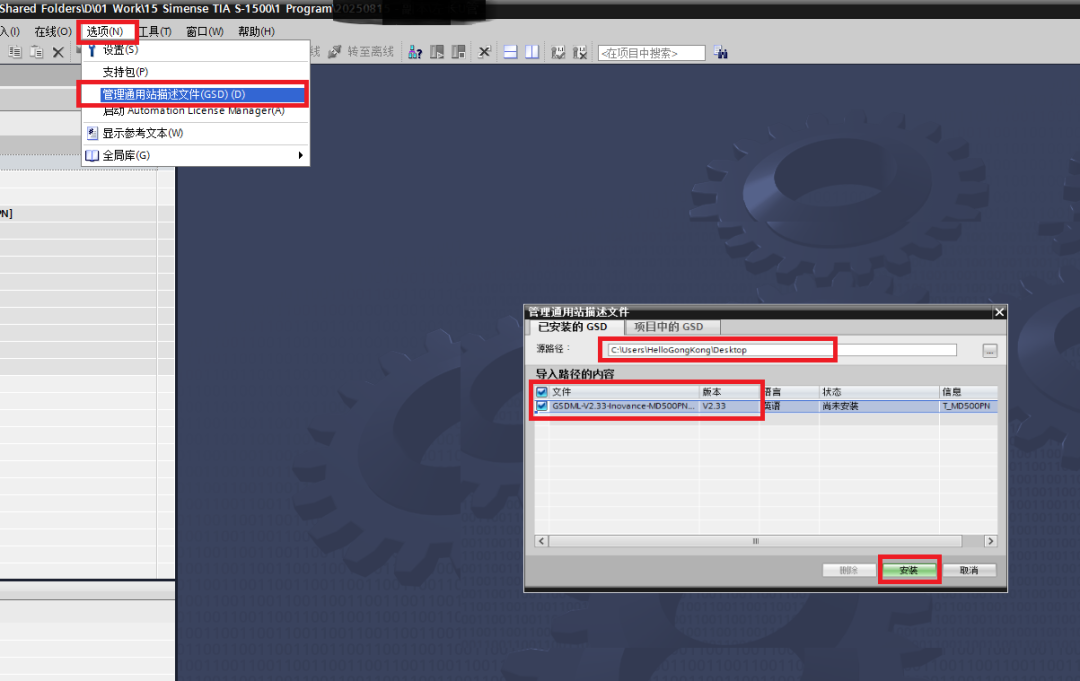 2.下载后放到电脑中,例如放到桌面备用。然后,找到TIA软件的菜单栏【选项】-【管理通用站描述文件(GSD)】: