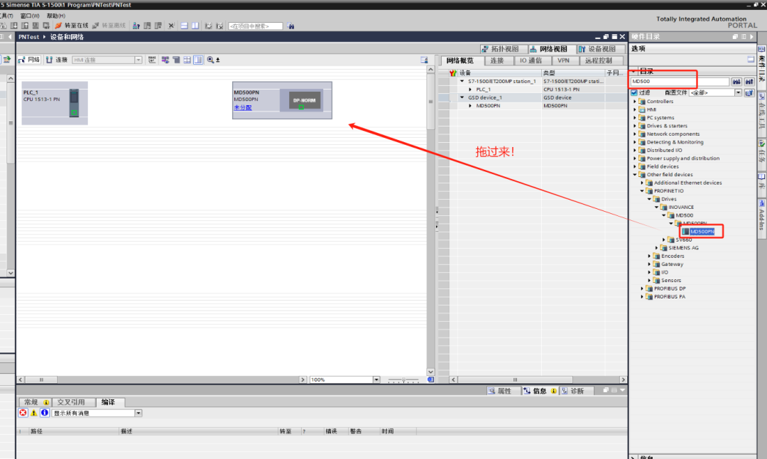 在【设备和网络】中,找到【网络视图】,可以在搜索框输入:MD500,如下图所示,将对应的MD500PN拖拽过来即可。