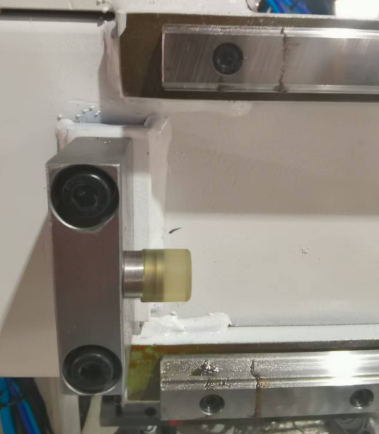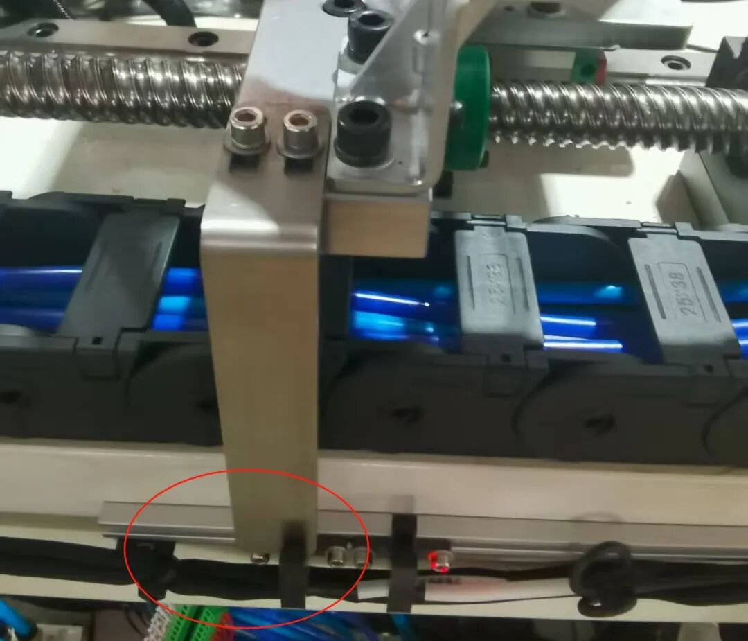 红色框中,下方是槽型的光电开关,信号输出作为原点开关信号。上方的金属块为感应挡块。