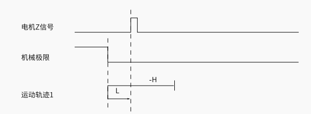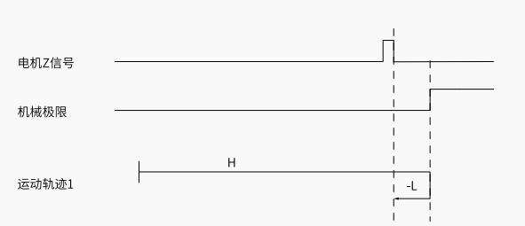 运动轨迹:伺服电机首先反向高速运行,撞到机械极限位置后,如果转矩达到转矩限制值,速度在零速附近,且此状态如果保持一定时间,判断为轴到达机械极限位置,电机正向低速运行,之后第一次遇到Z信号上升沿停机。