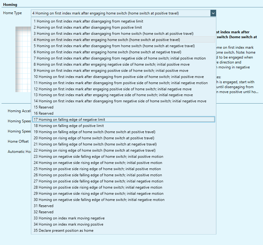 总共35种方式可以选择,HomeType的范围:1-35,每一种都有实际的回零方式说明,我这里项目用的是方式28,以这个举例: