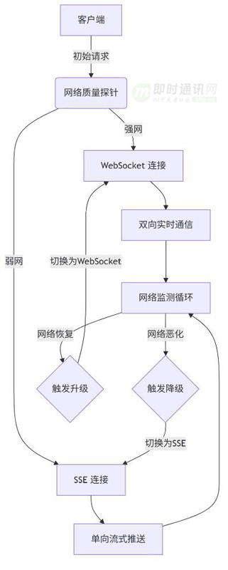 一般来说大型应用场景,强网用 WebSocket、弱网适合使用SSE ,这就是WebSocket+SSE 混合架构。强网用 WebSocket、弱网自动降级到 SSE 的混合架构, 核心在于网络质量动态评估和双通道无缝切换。
