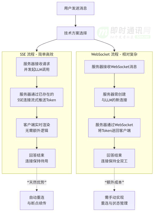 以下流程图清晰地展示了基于不同技术方案的聊天交互过程,其中突出了SSE方案的巨大优势: