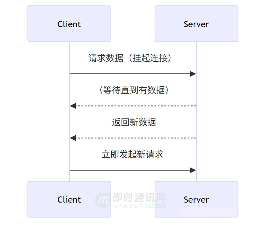 原理:使用长连接请求数据。 客户端发送一个请求,服务器会保持这个连接打开(长连接),直到有新数据可用或超时。一旦客户端收到响应,会立即发起下一个请求。