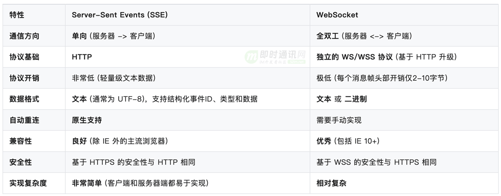 正如上图所示:SSE 方案在实现上更加直接和高效,因为它基于 HTTP,并且专门为服务器到客户端的单向数据流设计。
