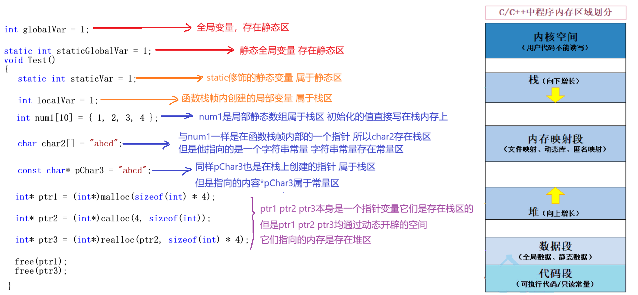 }上面代码中的一些局部变量、全局变量、静态变量、数组、指针等都存在什么地方?