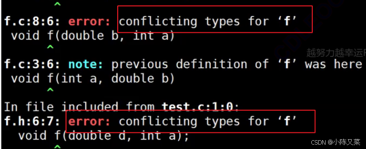 我们在Linux下看看报错信息:我们创建两个f函数,我们在Linux下用gcc编译看报错信息,我们发现这时就会报错说函数命名发生冲突。