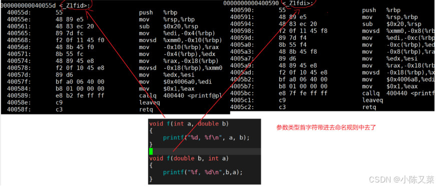 1是函数名长度,f是函数名,id(类型首字母PS:整形指针的是Pi)是int和double。也注意!这里没有解释返回类型的指令,这也可以说明为什么C++的返回类型不能作为函数重载条件的原因!