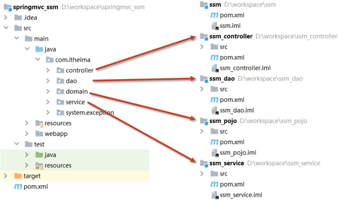 将原始模块按照功能拆分成若干个子模块,方便模块间的互相调用,接口共享,例如将各层拆分成对立的模块,这样项目每一层都可以单独维护,方便别人使用。