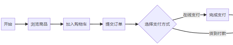 2.若选择“货到付款”,则跳过支付步骤进入发货流程。用Mermaid代码表示。展现效果: