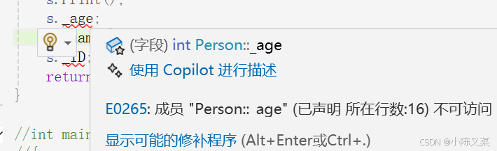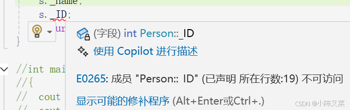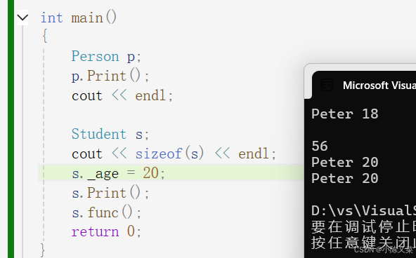 };派生类会继承基类的所有公共部分,同时基类的私有部分也会成为派生类的一部分,总的来说就是Student类定义的对象s,可以使用Person类中的公有方法