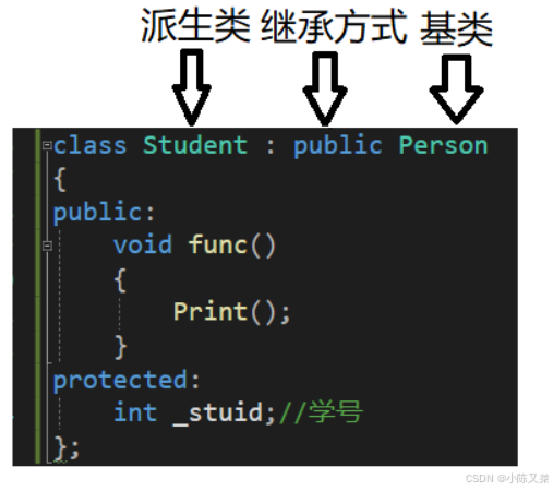 上文我们提到,Person是基类,Student是派生类,继承方式是公有继承: